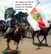 O clic é de domingo passado, em Moreira Sales, onde aconteceu a 15ª Cavalgada Cultural. O prefeito Luiz Volpato participou, com direito a puxar a fila empunhando a bandeira do município. E quem disse que só carro elétrico é opção contra os combustíveis fósseis?...