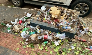 Situação da calçada na rua Francisco Albuquerque, perto dos Correios e da Câmara, no centro de Campo Mourão.