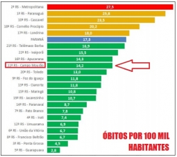 Em número de casos casos confirmados, a região a 14ª do Paraná, com 456 para cada 100 mil moradores.