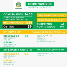Regional - Além de Campo Mourão, oito municípios da região confirmaram 16 casos de covid-19 nesta segunda-feira - Altamira do Paraná 1, Araruna 1, Barbosa Ferraz 1, Fênix 4, Goioerê 1, Moreira Sales 2, Peabiru 2 e Ubiratã 4. O total foi a 4.150, com 115 mortes.