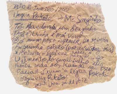 Olha só o que veio parar nas mãos de Boca Santa ! O rascunho “original” do maior sucesso deste carnaval: “Eguinha Pocotó”, do “poeta contemporâneo” MC Serginho. Como a “música” também vem sendo muito executada por aqui (geralmente em carrões importados conduzidos por filhinhos de papai), vale o registro. Aliás, é nessas horas que dá saudades dos tempos em que música ruim era “Fuscão Preto” (Almir Rogério), “Amor Perfeito” (aquela, do hospital, na sala de cirurgia...; do Amado Batista) e o “clássico” da pílula (“...pare de tomar a pílula!), de Odair José. Pelo menos essa turma era proibida de aparecer na TV e suas músicas, com “histórias tristes”, se tornaram “cults” graças às suas letras “engraçadas”. Ah, mas eles não tinham a “Lacraia” como “dançarina”, né?...