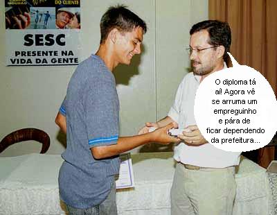 Olha aí, o prefeito Tauillo Tezelli foi pessoalmente entregar, na semana passada, os certificados de conclusão dos primeiros cursos profissionalizantes oferecidos pelo Centro de Iniciação Profissional (CIP). Foram diplomados 10 auxiliares de cozinha, 6 auxiliares de cabeleireiro, 14 do curso de informática básica e 43 de atendimento e recepção do cliente. Sete deles já estão empregados e outros três encaminhados. O CIP começou a funcionar em agosto com o objetivo de preparar rapazes em situação de risco social para o mercado de trabalho. O projeto é bonito, mas em outras palavras, a finalidade é dar trabalho para essa rapaziada para ver se eles dão sossego e não encomodam mais a prefeitura...