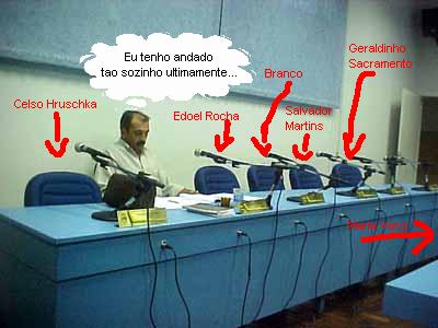 O que o vereador Isidoro Moraes está fazendo sozinho no plenário da Câmara de Campo Mourão? Está participando de uma sessão ordinária. O clic foi feito ontem à noite, quando apenas 11 dos 17 vereadores aparecem na reunião. Os outros seis foram para Brasília. Por coincidência, cinco dos seis viajantes sentavam na mesma bancada de Isidoro, que acabou ficando sozinho. Enquanto seis vereadores se apertavam do outro lado e mais quatro na mesa diretora, Isidoro ficou com o espação todo para ele. Agora diga que a oposição não ficou isolada, diga!...