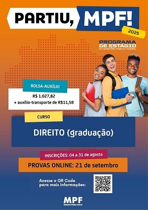 O Ministério Público Federal de Campo Mourão está com inscrições abertas para estágio remunerado de estudantes de direito. O programa oferece uma bolsa no de R$ 1.027,82 para 20 horas semanais, além de auxílio transporte de R$ 11,58. Interessados precisam se inscrever até o próximo dia 31. As provas serão online no dia 21 de setembro.