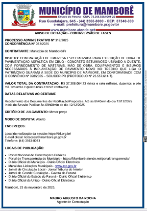 A prefeitura de Mamborê marcou a licitação para asfaltamento da estrada que liga a cidade ao distrito do Guarani.