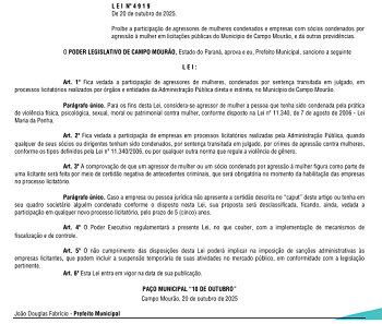 O prefeito Douglas Fabrício sancionou a lei que proíbe agressores de mulheres de participarem das licitações da prefeitura de Campo Mourão.