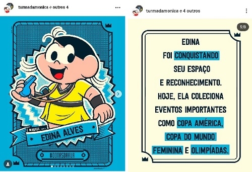 “Ela é uma inspiração para as nossas futuras árbitras, conheça a Dona da Rua, Edina Alves”. Foi assim que a Turma da Mônica homenageou a árbitra Edina Alves, de Goioerê. Ela foi representada pela personagem Magali. A postagem em redes sociais foi feita nesta quinta-feira. Termina com uma frase da goioerense: “Não quero ser tratada como ‘a árbitra mulher’, apenas como árbitra”.