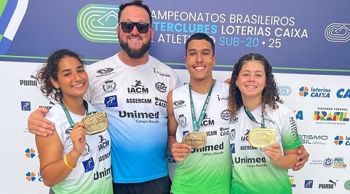 A equipe de atletismo do IACM/Fecam/Assercam, de Campo Mourão, participou no fim de semana do Campeonato Brasileiro Sub-20, no Recife/PE. Está voltando para casa com mais três medalhas de bronze - Fernando Perez dos Santos (lançamento do disco), Letícia Dominelli Daniel (lançamento do disco) e Jade Vieira das Neves (lançamento do martelo). Os três são treinados pelo professor Sidmar Gielow. Detalhe: o trio medalhista ainda é sub-18.