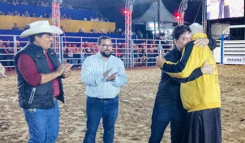 Oclecio Menseses, prefeito de Farol, ao chamar os padres Paulo Versari Conceição e Markus Prim para ficarem ao seu lado, e destacar que o município vive um período de união. Lembrou que todos os vereadores participaram da Expofar 2025 e que nenhum vota contra projetos favoráveis ao município; sábado, ao discursar no último dia da Expofar.