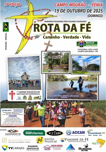 Estão abertas as inscrições para a 70ª edição da Rota da Fé. Será realizada no próximo dia 19 entre Campo Mourão e Fênix. Começa com uma missa celebrada pelo bispo d. Evandro Luís Braun, na Catedral São José, seguindo para a capela Santo Inácio de Loyola e o Parque Estadual de Vila Rica do Espírito Santo, em Fênix. A inscrição custa R$ 95 para adultos e R$ 50 para quem tiver de 12 a 17 anos, incluindo transporte e alimentação.