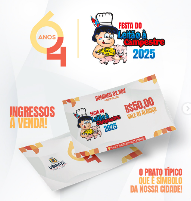 Já estão à venda os convites para a Festa do Leitão à Campestre. Valor? Cinquentão! O prato típico de Ubiratã será servido no almoço do dia 2 de novembro (domingo) dentro da programação de aniversário de 64 anos do município. Haverá apresentação especial da Orquestra de Ubiratã e, logo depois, show com Solange & Ticão. A programação completa vai de 31 de outubro a 4 de novembro e inclui, dia 3, show com Zezé Di Camargo & Luciano.