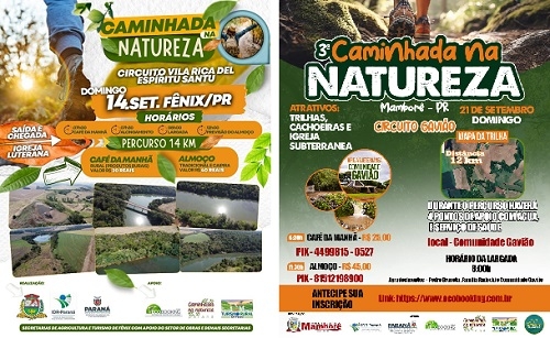 Três caminhadas internacionais na natureza estão programadas para este mês na região da Comcam. A primeira será em Fênix (dia 14), com os 14 km do circuito Vila Rica do Espírito Santo. Depois vêm Mamborê (dia 21), com o circuito do Gavião (10 km) e Campo Mourão (dia 28), com o circuito Salto do Boicotó (13 km). As inscrições para as três já estão abertas.