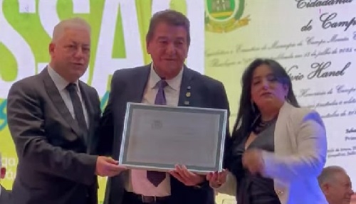 Teve sessão solene da Câmara de Campo Mourão neste sábado à noite. Foi no Mourão Garden, para a entrega do título de Cidadão Honorário ao empresário Névio Hanel. Ele recebeu a homenagem das mãos do prefeito Douglas Fabrício e da vereadora autora da iniciativa, Eliane do Café. Sete vereadores participaram da sessão. O secretário de Estado Márcio Nunes (Agricultura) também se fez presente.