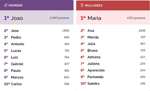 Campo Mourão tem 4.501 mulheres chamadas “Maria” e 2.060 homens chamados “João”. A informação foi divulgada nesta terça-feira pelo IBGE com dados atualizados do Censo 2022. Entre as mulheres, o segundo nome mais comum é “Ana”, com 2.835 registros. Entre os homens a vice-liderança é de “José”, com 1.899. Márcia e Pedro completam, respectivamente, os pódios de cada gênero.