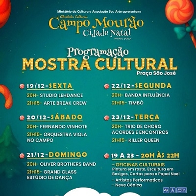 A Associação Sou Arte definiu a programação da Mostra Cultural, que será realizada de 19 a 23 deste mês e que faz parte do projeto Atividades Cultural Campo Mourão Cidade Natal. Serão duas apresentações por noite, na praça São José (veja acima). Paralelamente serão realizadas oficinas culturais (com pintura de rostos, escultura em bexigas e de carta para o Papai Noel).