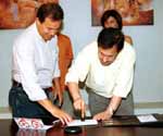 A prefeitura de Campo Mourão foi palco, ontem à tarde, do lançamento estadual do selo “Luta conta a Aids”. O prefeito Tauillo Tezelli e o gerente regional dos Correios, Carlos Roberto Mariani (foto), fizeram a obliteração do primeiro selo, que vai para um museu em Brasília. Izael Skowronski, que já foi carteiro, obliterou o segundo, que foi para o Museu Municipal. Ai-aiai-aiai! Obli o quê mesmo?...