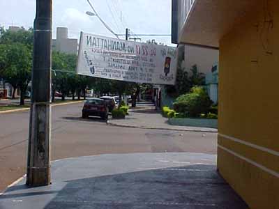 Que em Campo Mourão todo mundo sai amarrando faixas publicitárias por onde bem entende nem é novidade. Quem mais paga o pato é a arborização pública. Não foi bem esse o caso dessa faixa colocada na esquina da av. Capitão Índio Bandeira com a rua São Josafat. O problema dessa aí é a sua altura. Quem tem mais de 1,80 metro tem que se abaixar para passar pela calçada. Ou atravessar a rua. E olha que não é faixa anunciando campanha de utilidade pública, não. Nada de prevenção à dengue ou doação de sangue. É propaganda de festa privada mesmo. Ah, quem manda não andar de carro?...