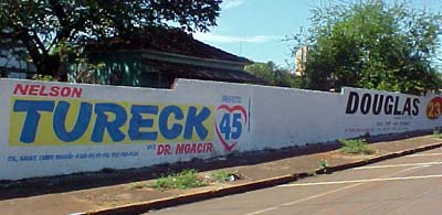 Vejam só, enquanto o governo de Israel constrói um polêmico muro para separar judeus de palestinos, em Campo Mourão é justamente um muro que está “unindo” dois dos quatro candidatos que disputam a prefeitura. Fica na esquina da rua Interventor Manoel Ribas com a av. Goioerê. As propagandas de Douglas Fabrício e Nelson Tureck ficam lado a lado, no muro do mesmo imóvel. Tá certo que há um espaço em branco entre eles, mas quem garante que já não esteja reservado para as propagandas de Valdete Rodrigues de Almeida e Osni Menezes?...