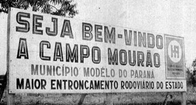 Quem está na casa dos 40 anos e morava em Campo Mourão em 1971 talvez se lembre dessa placa aí. Ela ficava na saída para Maringá. Foi colocada pelo então prefeito Horácio Amaral. Repare no canto direito o símbolo da administração, feito a partir das iniciais do nome do prefeito (HA). Hoje isso não seria permitido (promoção pessoal), mas na época era moda. A foto está no livro “Horácio Amaral – Exemplo e Desafio”, que Jair Elias dos Santos Júnior lança neste sábado no Teatro Municipal. E cá pra nós: essa de “maior entroncamento rodoviário do Estado” já contava com a Boiadeira, não contava?...