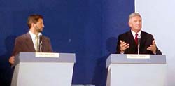 Tureck falou da dívida com a Sanepar no penúltimo bloco do debate (foto). Nas considerações finais ninguém tocou no assunto. O prefeito em exercício, Getulinho Ferrari, disse que a prefeitura não paga a Sanepar porque a empresa também tem débitos com o município. Falta fazer as compensações. A administração deve ir hoje às rádios explicar o caso. Olha aí, já é um a menos pra pedir voto...