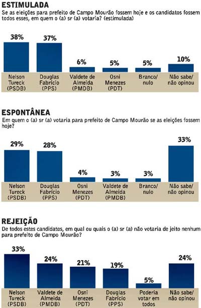 Nelson Tureck e Douglas Fabrício estão tecnicamente empatados na disputa pela prefeitura de Campo Mourão. Foi o que revelou ontem à noite pesquisa do Ibope divulgada pela RPC. Tureck teve 38% das intenções de voto, contra 37% de Douglas. A diferença de um ponto percentual significa pouco mais de 500 votos. Mas ela está dentro da margem de erro, que é grande: 5,6 pontos percentuais para mais ou para menos. Os outros dois candidatos apareceram bem atrás: Valdete Rodrigues com 6% e Osni Menezes com 5%. Outros 10% não sabem ou não quiseram opinar, enquanto 5% manifestaram voto nulo ou em branco. Se vocês somar todos esses números dará 101%, mas foi assim que o “Paraná TV – 2a Edição” divulgou. Ah, isso é campanha acirrada: estourou até o Ibope...