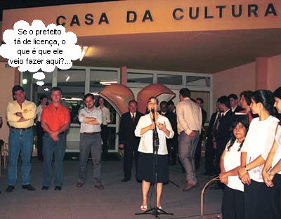 Com a presença de integrantes do movimento artístico-cultural e lideranças empresariais e comunitárias, além de populares, aconteceu anteontem à noite a inauguração das reformas da Casa da Cultura. A obra custou R$ 75 mil, com o dinheiro vindo a fundo perdido da Sanepar. O deputado Marcos Isfer, que disponibilizou a verba, estava presente e discursou. Com adesivo da campanha do “23” no peito e tudo. Desta vez não teve buquê de flores, mas o coral cantou em homenagem ao prefeito licenciado Tauillo Tezelli e ao prefeito em exercício Getulinho Ferrari. Virou moda: a prefeitura convida o público para ver a “alta cúpula” homenagear eles mesmos. Ah, nada que uma boa dose de “semancol” não resolva...