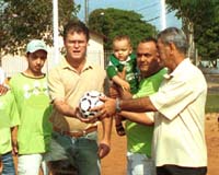 A prefeitura reinaugurou duas praças esportivas que andaram recebendo melhorias. Uma delas foi no Barreiro das Frutas, onde agora o campo de suíço tem até iluminação. Já no Cohapar, a reforma foi na cancha de areia. Teve ainda repasse de bola e jogos de camisa (foto). Quem diria! Agora, veja a foto e diga que o prefeito em exercício Getulinho Ferrari não está com a bola toda, diga!...