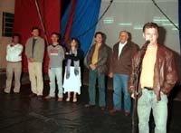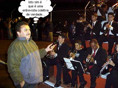 Olha aí mais um clic da inauguração da iluminação do estádio Roberto Brzezinski. E esse aí em primeiro plano é o Benedito Rodrigues, da assessoria de imprensa da Coopermibra. Ele estava por lá porque foi a cooperativa que cedeu o som para o evento. E para que a música da Banda Municipal pudesse sair pelos alto-falantes, Benedito não pensou duas vezes: fez as vezes de pedestal e ficou lá segurando o microfone. Além do mais, quem falou que “entrevista coletiva” é só quando vários repórteres entrevistam uma pessoa de uma vez? Por que não pode ser ao contrário, uai?...