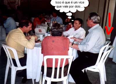 O tour que o vice-governador e secretário de Estado da Agricultura, Orlando Pessuti, vem fazendo pela região desde quarta-feira incluiu um almoço ontem em Goioerê. Olha ele aí na mesa junto com o presidente da Suderhsa, Darcy Deitos, e com os prefeitos de Moreira Sales, Hugo Berti, e de Goioerê, Antônio Sena (de costas)! E repare bem: Pessuti, que é, literalmente, um político de peso, usou duas cadeiras para sentar. Pudera. Essas cadeiras de plástico não são lá muito confiáveis, não. Se bem que Hugo Berti, magro ao estilo Marco Maciel, não deve se preocupar muito com isso...