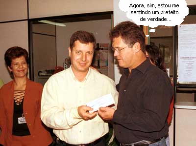 O prefeito em exercício Getulinho Ferrari está mantendo o ritmo da administração. Na quinta-feira, ele não deixou de participar nem da tradicional entrega mensal de chequinhos às instituições. Desta vez a solenidade aconteceu na sede da Apae. Olha ele aí repassando o cheque da Apae (R$ 2,2 mil). No total, foram R$ 34,2 mil para 13 entidades. Eles variaram de R$ 8 mil (Amecam) e R$ 180 (Aracampo). Foi o sexto repasse do ano. Uai, se de grão em grão a galinha enche o papo, imagine de chequinho em chequinho...