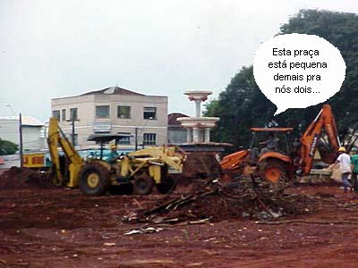 A chuva deu uma trégua e os tratores trabalharam a todo vapor ontem à tarde nas obras de revitalização da praça Getúlio Vargas. Pudera. Enquanto as obras na São José seguem para os detalhes finais, na praça ao lado tudo ainda está muito cru. Quase nada saiu depois que as árvores foram derrubadas. E quem olha já acha que as obras não ficam prontas até o fim do ano, não. Daí, já viu, ficará para o próximo prefeito inaugurar. Se bem que existe uma lei municipal que permite, desde que se trata de reformas, a inauguração de obra inacabada. E cá pra nós: a placa dá tempo de fazer, não dá?...