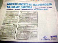 Responda rápido: o que é que interessa para Campo Mourão e região que a Sanepar vá investir R$ 350 milhões em Curitiba? Nada. E não é que o governo do Estado pagou anúncio de meia página em jornais da região para anunciar as obras? Nada contra propaganda. Mas se era para anunciar, por que não anunciaram as obras de rede de esgoto quer estão sendo feitas por aqui? Ah, dinheiro público...