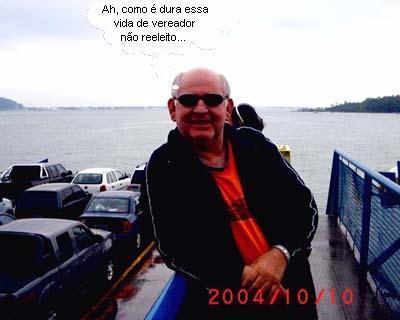 A data aí no cantinho direito, ainda que do jeito norte-americano, não deixa a gente mentir: a foto foi feita em 10 de outubro deste ano, dia do aniversário de Campo Mourão e uma semana depois das eleições municipais. E olha o vereador Luiz Carlos Kehl, com pose de Robert Redford, durante travessia do ferry boat, no litoral paranaense. No domingo anterior ele tentou o quarto mandato seguido de vereador. Não deu. Desta vez o povo não entendeu a mensagem. Daí, nada melhor do que aproveitar o feriadão para ir à praia com a família. Por azar, o tempo não ajudou muito, mas isso não precisa contar para os amigos, precisa?...