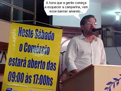 O prefeito Tauillo Tezelli demonstrou bom humor ao discursar ontem à noite no lançamento da campanha “Campo Mourão Cidade Natal”. Primeiro brincou, dizendo que pensou que iriam chamar o prefeito eleito, e avisou que continua no comando da prefeitura até 31 de dezembro. Depois, frisou que o banner que Acicam e CDL darão às empresas participantes da campanha vai agradar o próximo prefeito, pois é todo amarelo, cor do adversário de campanha. Tezelli não disse nomes, mas referia-se ao “amarelão” que virou símbolo da campanha de Nelson Tureck. Mas há um consolo: ao menos a campanha não fala em coração, não tem tucano e não sorteará “45” prêmios...